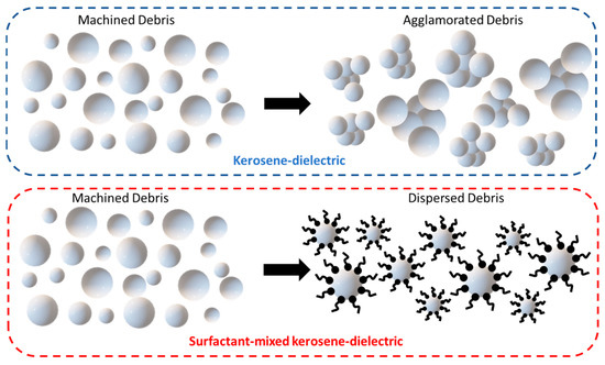 The agglomeration and dispersion phenomena of debris using kerosene dielectric vs. surfactant-mixed kerosene dielectric.