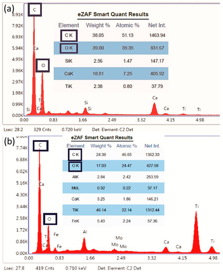 Chemical analysis of (a) kerosene-based dielectric at pulse ON:OFF time of 50:50 µSec, and using a graphite electrode and (b) S-60-based kerosene dielectric at 25 g/L, pulse ON:OFF time of 50:100 µSec, and using a graphite electrode.