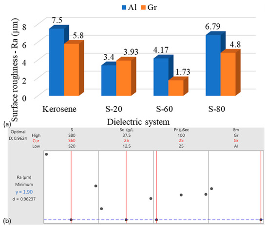 Experimental results of process of the optimization of surface roughness; (a) optimized results for each dielectric type; (b) optimized results from all variables.