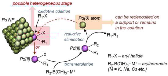 Simplified scheme of Suzuki cross-coupling in the presence of nanoparticulate ligandless catalyst involving both heterogeneous and homogeneous stages.