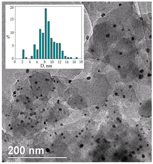 Synthesized Pd(0)/HPS was analyzed by the XPS and S/TEM. It was found that Pd(0)/HPS contains numerous palladium NPs with a mean diameter of 8.2 ± 2.4 nm located in the HPS’ pores (Figure 2). According to the XPS data, the following values of binding energy of Pd 3d5/2 were found []: 335.0 eV (metallic Pd), 336.3 eV (partially oxidized NPs PdO/Pd), and 337.2 eV (PdO). The presence of Pd(II) on the surface of the preliminarily reduced HPS-based sample was due to the fact that the catalyst was stored in air.