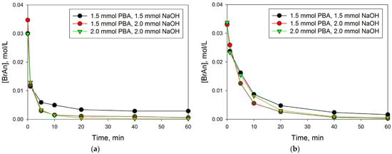 (ii) Influence of the initial concentration of BrAn ([BrAn]0) while maintaining the initial molar ratio of BrAn-to-PBA and NaOH (EtOH/H2O = 5:1, 60 °C, N2, 800 two-sided shaking/min);