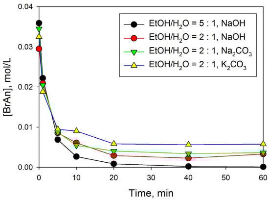 As expected, the replacement of alkali (NaOH) by weaker bases (K2CO3 or Na2CO3) did not lead to deep BrAn conversions (Figure 4).