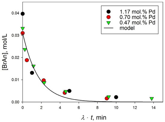 Thus, all data from a series of one-factor experiments with a change in the amount of Pd(0)/HPS catalyst on the plot of [BrAn]i vs. (λ t) represent a single diagram with one trend line (Figure 5).