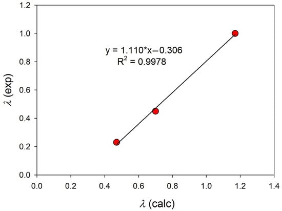 Theoretically, the numerical value of the coefficient (λ) should be equal to the ratio of catalyst amounts (Equation (7)), which we will refer to as λ(calc). However, the obtained coefficient λ(exp), at which the current [BrAn]i concentrations of other experiments were superimposed on the trend line of the comparative experiment, does not correspond to the calculated one, although there is a linear relationship between them (Figure 6).