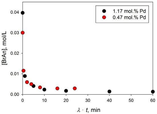 Dependence of the current concentration of BrAn on “conditional” reaction time in a series of experiments with different amounts of Pd(II)/HPS catalyst (black circle—1.17 mol.%, red circle—0.47 mol.%).