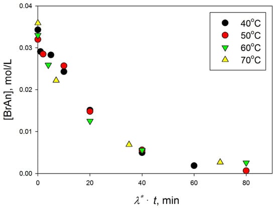 Let us choose as a comparison curve the trend line of consumption of BrAn concentration over time at 40 °C. Then, the form of kinetic curves in coordinates [BrAn]i vs. (λ*·t) can be seen in Figure 8. As can be seen from Figure 8, all data on the change in the concentration of BrAn depending on the reduced time (λ*·t) are relatively well located along the same trend line.