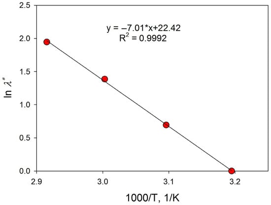 To study the effect of temperature on the reaction using the Pd(0)/HPS catalysis, a series of experiments was carried out in the temperature range of 40–70 °C with constant values of other parameters (0.47 mol.% Pd, 1 mmol BrAn, 1.5 mmol PBA, 2 mmol NaOH, EtOH/H2O = 5:1, N2, 800 two-sided shaking/min). This series of reactions can be viewed as a series of one-factor experiments, and a “time transformation” method similar to that used to study the effect of the amount of catalyst can be applied. In Equation (6), instead of the ratio of the amounts of catalyst, we will consider the ratio of the process rate constants (λ*), assuming that the constant is a mathematical factor for the kinetic equation of the process and has the following form (Equation (9)):