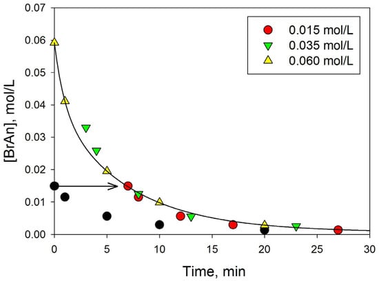 The arrow in Figure 10 shows how the current concentrations of the experiment with an initial BrAn concentration of 0.015 mol/L (black circle) coincide with the trend line of the experiment with an initial BrAn concentration of 0.060 mol/L, on which the experimental data with an initial BrAn concentration of 0.035 mol/L are already shown. Figure 10 shows that when the current concentrations [BrAn]i are shifted for experiments with initial concentrations of 0.015 mol/L and 0.035 mol/L to the trend line of the comparison experiment, a single dependence with a single trend line is formed. In other words, the law of change in the current concentrations of BrAn at their different initial concentrations is the same.