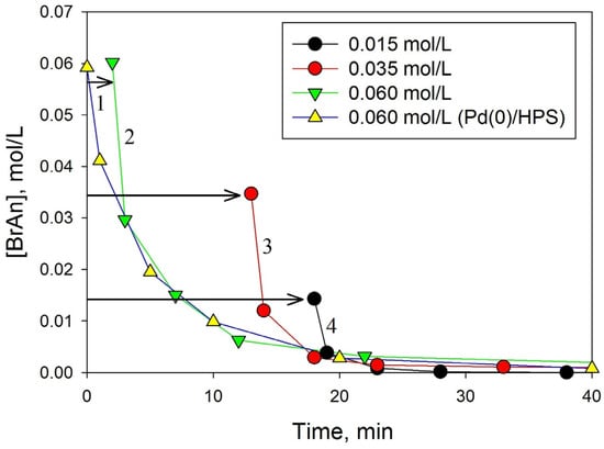 The data obtained under Pd(0)/HPS catalysts at the maximum initial concentration of BrAn (Figure 11, curve 1) were compared with the data obtained under Pd(II)/HPS catalysis (Figure 11, curves 2, 3, and 4). For this purpose, the current concentrations of [BrAn]i obtained for catalyst Pd(II)/HPS (Figure 11, curves 2, 3, and 4) were time-shifted so that they overlapped the trend line of the comparison experiment (Figure 11, curve 1).