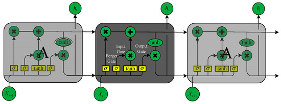 In Equation (7), denotes the weighting matrix, denotes the bias, and the input gate is used to determine the information added to the cell state, as shown in Equations (8) and (9) with the same input form as the forgetting gate. The sigmoid layer determines the information needed to update the original cell state , and the tanh layer generates the updated content , multiplied by the two corresponding positions to form the cell state update matrix.