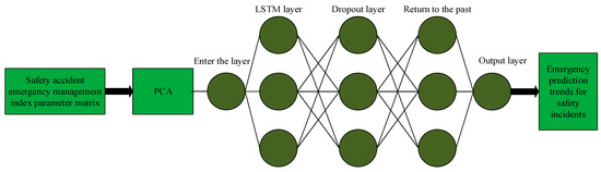 In Equations (10) and (11), represents the output of LSTM units at time , refers to the calculation of the output gate at time point in the LSTM network, represents the hyperbolic tangent activation function. Figure 2 shows the topology of the LSTM network model of this study. The implicit layer in this study is set to three layers, LSTM layer, unregulated deactivation (dropout layer), and regression layer, and finally outputs the anticipated degradation trend. This is conducted after extracting the safety incident emergency management index parameter matrix for the principal component analysis method of dimensionality reduction.