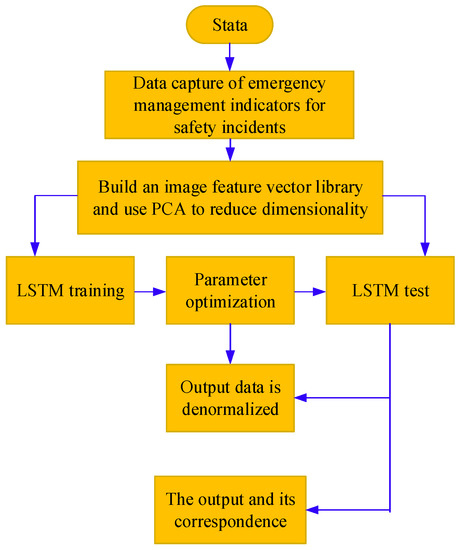 The specific process is shown in Figure 3, and the process is as follows: First, the network connection information is captured using the Sniffer in the network acquisition module, and the relevant safety accident emergency management index data are collected from the network. Secondly, after converting the character data on the network link into integer data, the data pre-processing unit is used to pre-process the safety accident emergency management index data, and the original input vector is then obtained through data normalization processing. Thirdly, the initial input vector is extracted by using principal element analysis, and the redundant data are eliminated to obtain the reduced dimensional input vector. The reduced-dimensional input vector is learned using the LSTM method under the LSTM model in order to obtain the best set of parameters , which are then saved in the event record database. The reduced-dimensional vectors are found using the LSTM method under the LSTM test approach. The output results are obtained, and they are then saved in the database so that their safety incident emergency management levels can be determined based on the information from the prediction. The mean square error (MSE) and the root mean square error (RMSE), which are two indicators used in this paper to assess the stability and accuracy of the model proposed in the study [23], are shown in Equations (6) to (7).