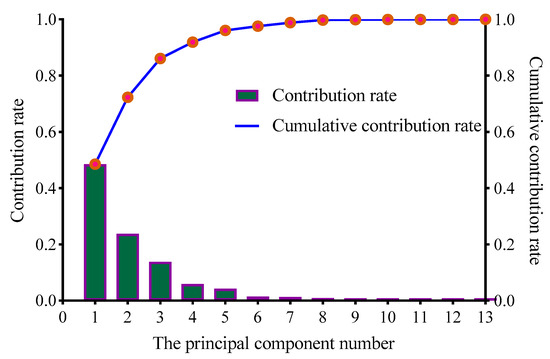 Equation (6) was used as a constraint function in this study to determine the principal component components following the dimensionality reduction of PCA. In general, a cumulative contribution value between 85% and 95% captures most of the data information and effectively reduces the dimensionality of the raw data.