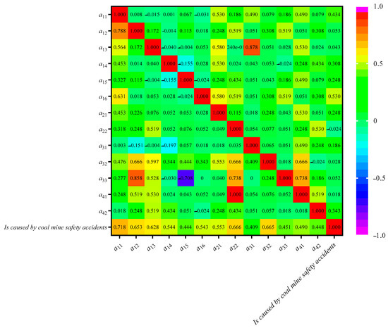 As can be seen in Figure 4, the first three principal components accumulated 86.06%, which surpassed 85%, indicating that they have covered the majority of the impact factors. Principal components 1, 2, and 3 each contributed 48.54%, 23.769%, and 13.757% of the total, respectively, so only the first three principal components, or the risk indicators of prevention preparedness (A1), were retained. Specifically, three safety incident emergency management risk assessment evaluations, specifically divided into hazard identification and monitoring (a11), safety inspection and warning (a12), and emergency planning and training (a13), were then added to the pre-built model for additional prediction as well as safety incident emergency management evaluation. To ascertain whether the established model input indicators were connected to safety incident emergency management, additional correlation tests were run on them.