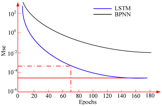The LSTM network model’s training performance plot is shown in Figure 7. The MSE values for the test group are displayed in the figure. For the LSTM network, it can be seen that the MSE value was high at the start of the training phase and then declined as the number of training steps rose. The MSE value’s decline suggests that the error value was steadily going down. The training of the LSTM network model was stopped when the model achieved the best training performance after 112 training steps, and the MSE error was subsequently maintained at 10−5. After 180 iterations, the BPNN model’s MSE value was still outside this study’s established range, and its feasibility was very low. This indicated that the LSTM network model used in the research was very feasible and that the expected error value had been reached. Table 3 displays the RMSE and R2 of the model’s expected outcomes.