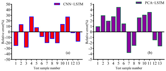 (a) The mean relative error of CNN-LSTM model; (b) The mean relative error of PCA-LSTM model.