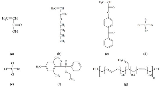 Chemical structures of the compounds: (a) acrylic acid, (b) n-butyl acrylate, (c) 4-acrylooxybenzophenone, (d) tetrabromomethane, (e) bromotrichloromethane, (f) TPOL radical photoinitiator (APO-type), (g) polybutadiene resin HTB.