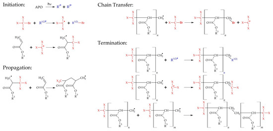 Scheme of the photochemically induced telomerization process where: R1(2) is a radical formed from the decomposition of APO photoinitiator, X is a Br or Cl atom, R3 is H, C3H9 or C6H6COC6H6.