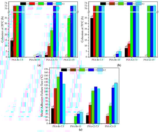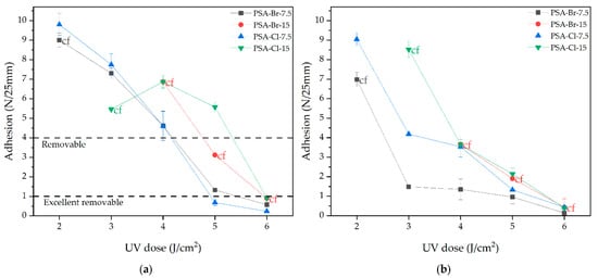 Interestingly, higher values of cohesion at 70 °C were noticed. This may be due to the better wettability of the steel substrate by PSAs. In particular, it concerned PSA-Cl samples and cross-linked with a UV dose of 4 J/cm2 (increase in cohesion at 70 °C to 72 h). It can also be stated that the best cohesion results (both at 20 and 70 °C) were recorded for the adhesive film based on Br-7.5 telomer syrup, as already at the UV dose of 3 J/cm2 the cohesion values were 72 h. However, the adhesion was too high for removable PSA products (7.3 N/25 mm; Figure 4a). This may be due to the lower viscosity of this telomer (13.8 Pa·s) and relatively high K-value (26 a.u.), thus facilitating the migration of radicals and formation of cross-linked structure. Considering the shear adhesion failure test (SAFT) results (Figure 3c) it can be concluded that the high thermal resistance was demonstrated for the PSA-Br-7.5 sample cross-linked by 5 J/cm2 (162 °C). Generally, higher values of the temperature at which adhesive failure occurred were noted for PSAs based on ATS with lower telogen content (7.5 mmol of CBr4 or CBrCl3). However, PSA-Br adhesive films (based on CBr4) turned out to be slightly better, even though Br-telomeres were characterized by slightly lower molecular weights than Cl-telomers (lower K-value, 26 a.u, and 42 a.u., respectively). It’s known that the shear measured as SAFT is directly dependent on the softening point (i.e., the molecular weight of the resin/polymer). In the case of PSAs based on ATS, it turns out that their photocrosslinking ability is also important. Systems with CBr4, due to slightly lower molecular weights and viscosity, show a higher photocrosslinking ability (already at 3 J/cm2, which was confirmed by cohesion tests at 20 and 70 °C).