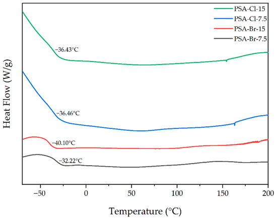 The Tg values for all acrylic PSAs were below −20 °C. Additionally, the Tg values for the PSA-Br-7.5 and PSA-Cl-7.5 and PSA-Cl-15 samples were very similar (−32 °C and −36 °C, respectively). Only PSA-Br-15 exhibited a lower Tg (−40 °C). These results correspond very well with the results of cohesion at 20 and 70 °C for these adhesive films (cross-linked with a UV dose of 6 J/cm2). Namely, samples with higher Tg (of the order of −30 °C) were characterized by high cohesion, resulting from a high cross-linking degree with the UV dose, hence lower mobility of polymer chains and higher Tg values. The opposite is for the PSA-Br-15 sample with the lowest cross-linking degree and short, more mobile telomeric chains.