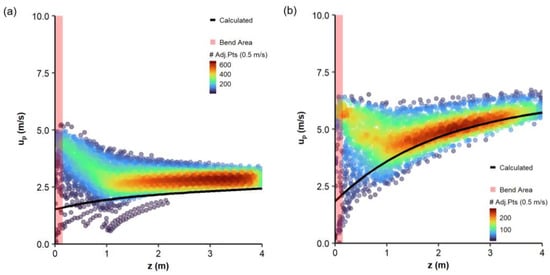 Seed velocity data for one-way coupled simulations at an air velocity of 25 m/s and seed rates of 0.07, 0.21, and 0.42 kg/s (Set 2) were considered in this section. The effect of seed rate was found to be significant (α = 0.05) through an ANOVA. A representation of the data is shown in Figure 9. The difference in behavior was most noticeable by comparing seed velocity data points from the smallest and largest seed rate (Figure 9a,c). The effect of seed collisions at higher seed rates influenced seed velocity profiles by reducing their average value. The effect of seed rate as described by the simulations was somewhat limited to the area near the bend because these were one-way coupled simulations. However, decreasing the seed velocities at the elbow exit caused the overall velocity profile to shift. Calculated seed velocities shown in Figure 9 provide a baseline for comparison purposes. Linear regression results from comparing average simulated seed velocity to calculated seed velocity values are shown in Table 5. The simulation at 0.07 kg/s seed rate had the best correlation to calculated values. Other simulated seed rates, 0.21 kg/s and 0.42 kg/s, had a relatively strong correlation to the calculated values but provide an indication that an additional solid loading ratio term might be needed to supplement the model proposed by Tripathi et al. [5]. Additional simulations and experiments working in parallel are still required to further document the effect of seed rate. Figure 9b,c reveal a few data points at the higher velocity range that were distinct from the main group of data points. Those data points represent the first few seeds entering the tube and were minimally affected by seed–seed collisions.