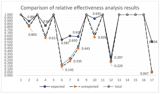 In Table 4, the expected output is the DEA efficiency evaluation based on expected output, the unexpected output, is the DEA efficiency evaluation based on unexpected output and the Total is the DEA efficiency evaluation based on all output. The comparison between these three values is shown in Figure 4. The comparison aims to determine the efficiency based on these three.