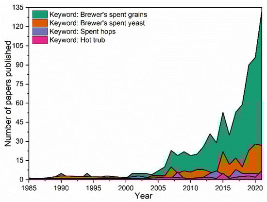 The brewer’s spent yeast generated after the fermentation step of hopped wort is the second brewing by-product, regarding to the volume of production, which corresponds to 13% of all by-products (Figure 1). This by-product is a rich source of proteins, carbohydrates, vitamins, and minerals, but its high level of nucleic acids limits its use as a human protein supplement due to the adverse health effects caused by excess uric acid [6]. During the last seven years, the use of brewer’s spent yeast has been growing; Figure 2 shows the evolution of the publication numbers. These studies present varied content, from the benefits of consumption of brewer’s spent yeast as animal feed to its use as a flavor enhancer food ingredient. Table 3 presents some examples of brewer’s spent yeast as a source of attractive compounds for the food industry.