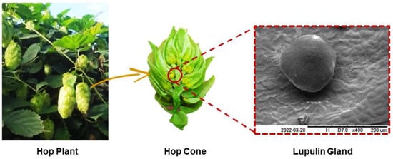 Hops flowers in situ, a transversal cut of hops cone, and lupulin glands via an image from an scanning electronic microscopic (data provided by authors).