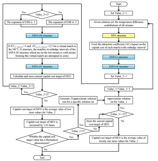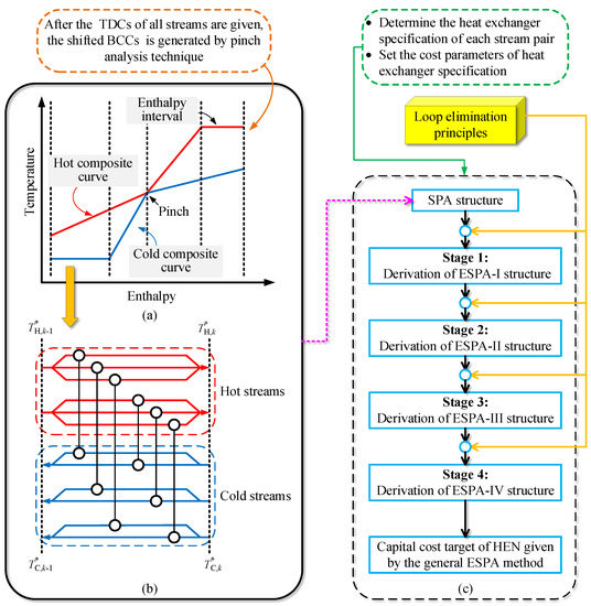 Figure 1 shows the calculation process of the general ESPA method. The main steps are giving the stream TDCs, generating the shifted balanced composite curves (BCCs) [27], dividing enthalpy intervals, SPA design of enthalpy interval, derivation of the final ESPA structure, and acquisition of the capital cost target.