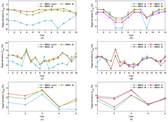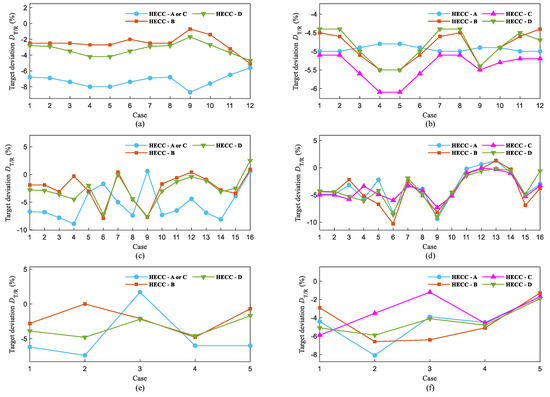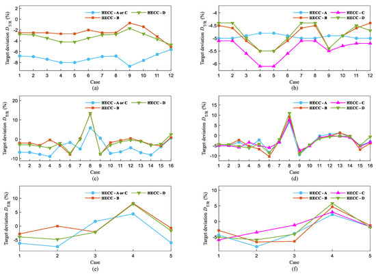 The poor stability of target deviation was mainly caused by target deviations of 13.5% and 8.2%, which occurred in case 8 of the second numerical experiment and case 4 of the third numerical experiment. By adjusting criteria to make the parameter greater than 2.5 to trigger a parallel-to-serial operation, the target deviations’ stability improved. The results of the target deviation are shown in Figure 3. The largest positive target deviations for two problem cases were remedied, while the other cases were basically unaffected. At this point, the target deviation range of all cases was (−10.3%, 2.5%) with a maximum deviation amplitude of 12.8%, verifying the effectiveness of the stability measure.