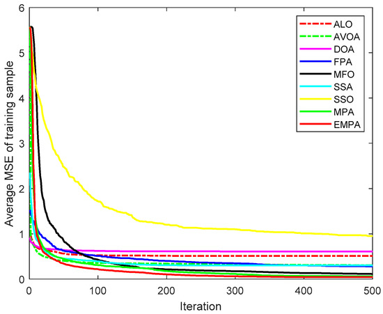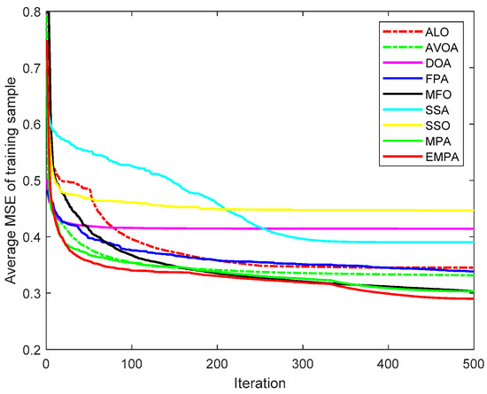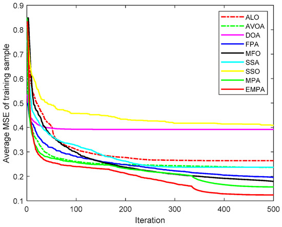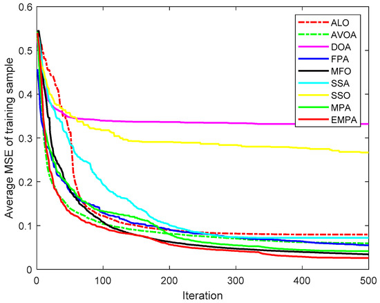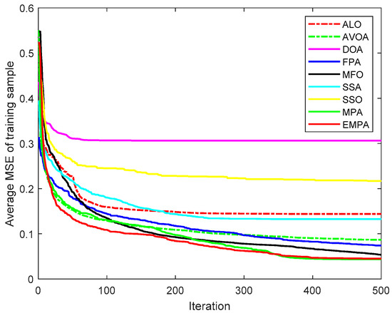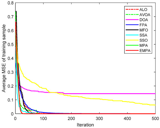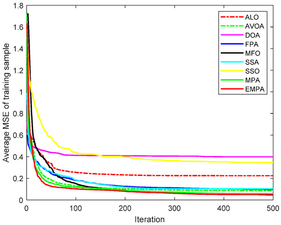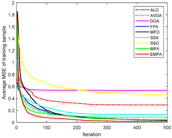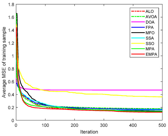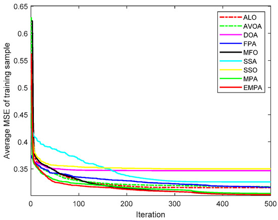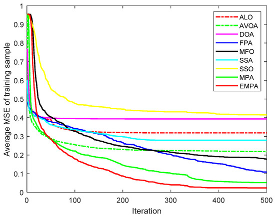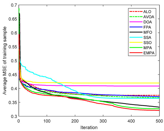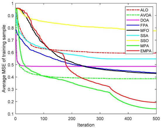 The MPA is derived from the universal hunting and gathering mechanisms, particularly Lévy flight, Brownian motion, and the optimal encounter rate policy between the predator and prey [42]. To enhance the availability and practicability, the ranking-based mutation operator was added to the basic MPA, which accelerates the calculation speed and enhances the exploitation to improve the selection probability to mitigate premature convergence. The EMPA was utilized to train FNNs, and the objective was to attain the minimum classification, prediction, and approximation errors by training the FNNs and modifying the connection weight and deviation value. The EMPA has the properties of straightforward algorithm architecture, excellent control parameters, great traversal efficiency, strong stability, and easy implementation. The EMPA integrates exploration or exploitation to determine the best solution. The experimental results demonstrated that the EMPA has certain effectiveness and feasibility to achieve a quicker convergence speed and a greater calculation accuracy. Meanwhile, the EMPA has strong stability and robustness for achieving a higher classification rate.
