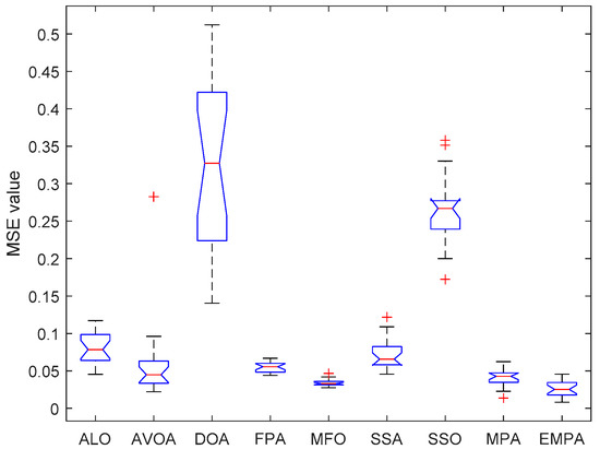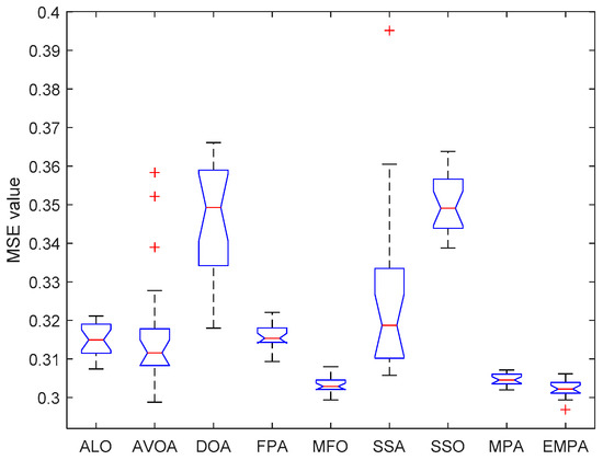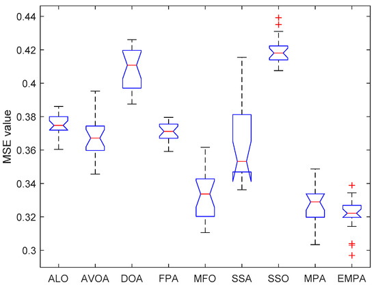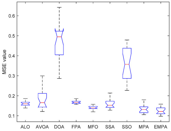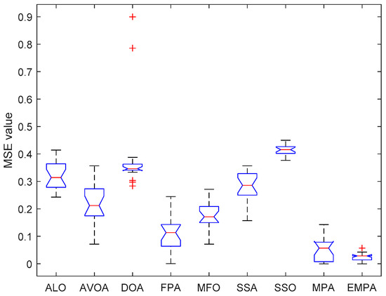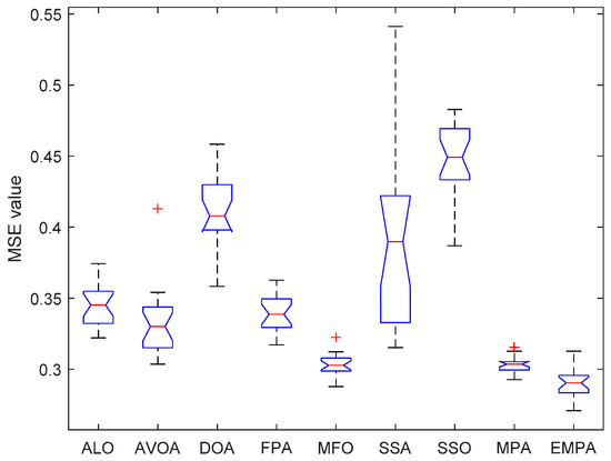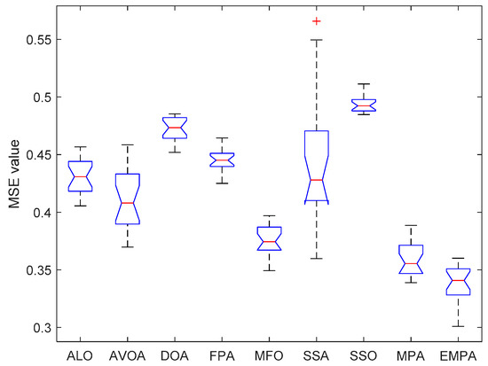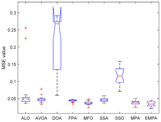 The ANOVA tests of the EMPA and other algorithms under different datasets are shown in Figure 20, Figure 21, Figure 22, Figure 23, Figure 24, Figure 25, Figure 26, Figure 27, Figure 28, Figure 29, Figure 30, Figure 31, Figure 32, Figure 33, Figure 34, Figure 35 and Figure 36. The standard deviation is an important method to measure the dispersion degree of data average values, which can accurately portray the stability and consistency of comparison algorithms in resolving the feedforward neural networks. The lower standard deviation showed that the algorithm has extensive exploration and exploitation to acquire more stable experimental data. For different datasets, the standard deviations of the EMPA were lower than those of the ALO, AVOA, DOA, FPA, MFO, SSA, SSO, and MPA, which indicates that the EMPA has exceptional stability and durability. The EMPA had greater computational efficiency and stronger dependability to attain a more stable standard deviation. The optimal values, worst values, mean values, classification rate and ranking of the EMPA were relatively better compared to ALO, AVOA, DOA, FPA, MFO, SSA, SSO, and MPA. The EMPA, based on the marine predators foraging strategy, utilizes a distinctive optimization mechanism of Lévy flight, Brownian motion, and the optimal encounter rate policy to determine the global optimal solution. The EMPA has strong global and local search abilities to avoid search stagnation and premature convergence, which enhances the convergence effect and optimization ability. The EMPA has strong stability and robustness to train the feedforward neural networks. Meanwhile, The EMPA has a certain superiority and significance for receiving the better connection weight and deviation value.