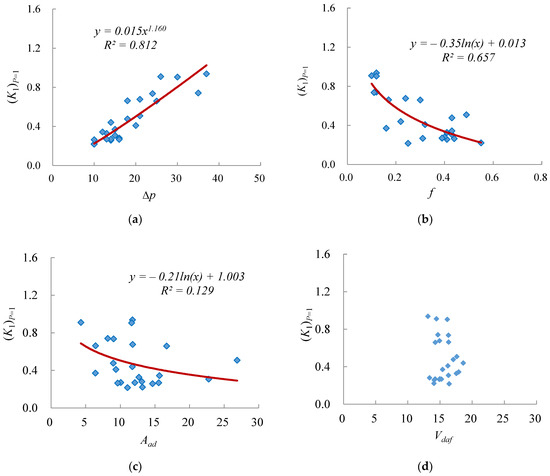 Relationship between (K1)p=1 and coal quality index. (a) Relationship between (K1)p=1 and Δp. (b) Relationship between (K1)p=1 and . (c) Relationship between (K1)p=1 and Aad. (d) Relationship between (K1)p=1 and Vdaf.