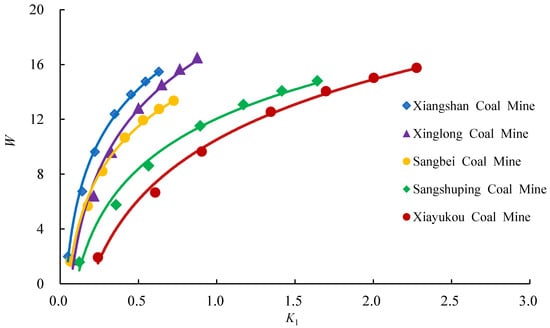 The coal seam gas content W in Equation (1) and the drilling cuttings gas desorption index K1 in Equation (2) are directly related to the gas pressure p, and as the gas pressure increases, K1 and W increase. To find the relationship between K1 and W, gas pressure p is set to 0.1, 0.5, 1.0, 2.0, 3.0, 4.0, 5.0 MPa. Equations (1) and (2) are used to calculate 7 K1 and 7 W corresponding to 7 gas pressures, and then, the nonlinear fitting is carried out. The W–K1 relationship model is obtained, and the correlation coefficient R2 is greater than 0.9900. The results are summarized in Table 2. One coal sample each (limited to the length of the article) was selected from the Xiangshan Coal Mine, Xiayukou Coal Mine, Xinglong Coal Mine, Sangbei Coal Mine and Sangshuping Coal Mine for nonlinear fitting. The fitting relationship curve is shown in Figure 2.