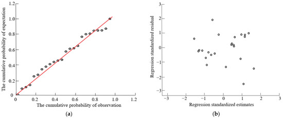From the standard P–P diagram and scatter diagram of the regression standardized residuals of the dependent variables C and D in Figure 3 and Figure 4, it can be seen that the standardized residuals are basically distributed around the asymptote, the scatters are basically linear, and the data and models are basically matched. The distribution of sample points is scattered and irregular, the residuals are random, and there is no heteroscedasticity. This shows that the residual basically obeys the normal distribution.