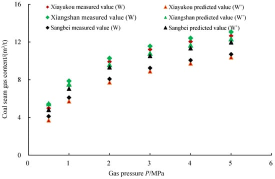 It can be seen from Table 4 that when the gas pressure is 0.5 MPa, 1.0 MPa, 2.0 MPa, 3.0 MPa, 4.0 MPa and 5.0 MPa, the variation range of the predicted value W′ of the mathematical model of coal seam gas content and the measured value W is 3.7021~13.0581 m3/t. The predicted value W′ and the measured value W increase with the increase in gas pressure. When the gas pressure is in the range of 0.5~5.0 MPa, the maximum deviation between the predicted value W′ and the measured value W is −2.3189 m3/t when the gas pressure is 4.0 MPa in the Xiayukou Coal Mine. The minimum deviation is 0.0711 m3/t corresponding to the gas pressure of 0.5 MPa in the Xiangshan Coal Mine. The average deviation is −1.2178 m3/t. The maximum error rate is −25.71%. The minimum error rate is 1.31%. The average error rate is −12.84%.