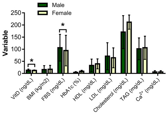 The analysis of health indicators revealed that VitD deficiency was related to high FBS (p = 0.058) and TAG (p = 0.056) levels and significantly low HDL levels (p = 0.015) (Table 1). Conversely, other health indicators, such as BMI, HbA1c, LDL, cholesterol, and Ca2+ levels appeared to be unrelated to the VitD status in those groups (Table 1).