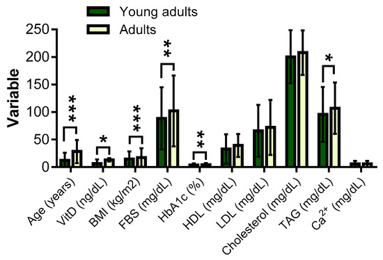 Mean age, VitD status and other health indicators in Libyan young adults and adults. N = number; % = percentage within population; BMI = body mass index; FBS = fasting blood sugar; HbA1c = glycosylated hemoglobin; HDL = high-density lipoproteins; LDL = low-density lipoproteins; TAG = triglycerides; Ca2+ =calcium; VitD = vitamin D. (*) indicates p < 0.05, (**) indicates p < 0.01, and (***) indicates p < 0.001.