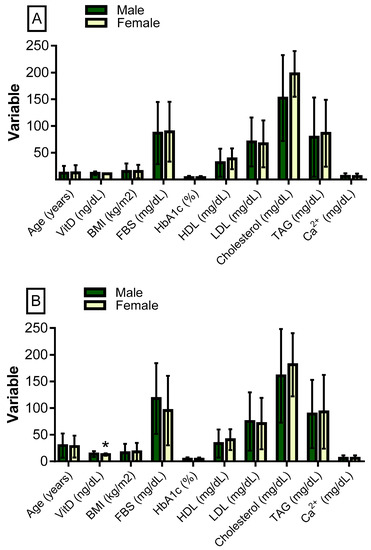 Regarding the VitD level cut-off, female participants had significantly lower levels of VitD than males in both the VitD deficient and insufficient groups (p = 0.043 and p = 0.019, respectively; Table 1). The mean VitD levels in these groups were 6.33 ± 2.65 and 19.61 ± 4.20 ng/dL in males and 5.2 ± 2.31 and 17.63 ± 5.24 ng/dL in females, respectively (Table 1). In the group with sufficient/normal VitD levels, the mean VitD levels were 34.22 ± 9.82 and 38.09 ± 9.82 ng/dL in male and female subjects, respectively, without any significant differences (Table 1).
