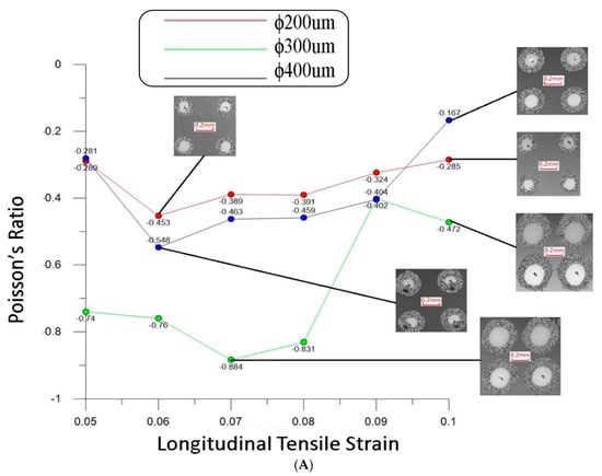 Poisson’s ratio distributions of different truss structure thicknesses and PDMS mold rolling belt thicknesses: (A) PDMS mold rolling belt was designed with a thickness of 0.5 mm and (B) PDMS mold rolling belt was designed with a thickness of 1.5 mm.