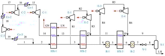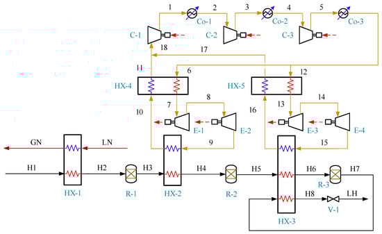 In the Brayton liquefaction process (Brayton liquefier) as illustrated in Figure 2, the hydrogen is pre-cooled by the liquid nitrogen with an equal flow rate as in the Claude liquefier. Thereafter, the Brayton refrigeration cycle provides the cold energy used for further cooling and liquefaction of hydrogen. In the Brayton refrigeration cycle, helium as refrigerant is compressed by the three-stage compression system with interstage cooling. The compressed helium is divided into two streams and pre-cooled to different temperatures in the HX-4 and HX-5, respectively. They can provide cooling for hydrogen after expansion in each refrigeration loop. After passing through the conversion reactor to increase the proportion of para-hydrogen and the J-T valve to reduce the pressure in turn, the liquefied hydrogen is stored.