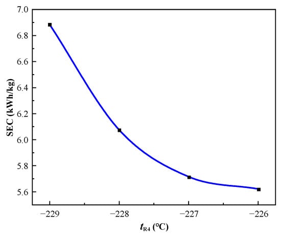 In this study, sensitivity analysis is employed to optimize stream parameters for both liquefiers. The cooling temperature of hydrogen (tR4) is the only parameter affecting the performance of the Claude liquefier, because the feed parameters, the product parameters and the pre-cooling temperature of hydrogen are constant values. The effect of tR4 on the SEC of the Claude liquefier is given in Figure 3. The SEC of the Claude liquefier shows a trend of monotonically decreasing with the increase in tR4. During the increase in tR4 from −229 °C to −226 °C, the SEC of the Claude liquefier is reduced from 6.88 to 5.62 kWh/kgLH, a reduction of up to 18.3%. Therefore, the selection of tR4 has a considerable influence on the SEC of the Claude liquefier. The system has requirements for the temperature that the refrigerant can reach in the second stage refrigeration loop. Therefore, the value of tR4 only can be increased to −226 °C, as shown in Figure 3.