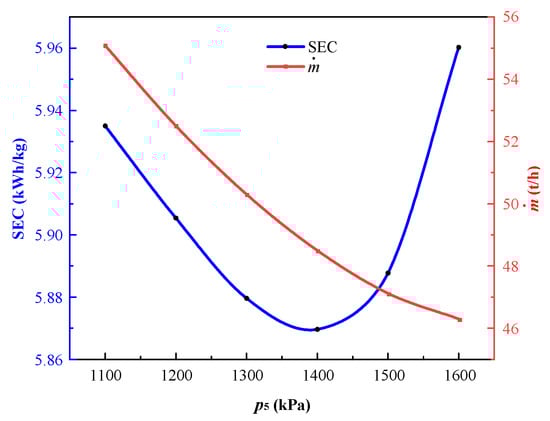In the Brayton liquefier, the pressurization pressure of helium (p5) and the cooling temperature of hydrogen (tH4) are key parameters affecting the process performance. Among them, the effect of tH4 on the Brayton liquefier is similar to that of tR4 on the Claude liquefier. Therefore, only the effects of p5 on the Brayton liquefier are analyzed, as shown in Figure 4. As the pressure increases, the mass flow rate of the refrigerant required for the Brayton liquefier keeps decreasing, while the SEC of the Brayton liquefier is first decreasing and then increasing. There is a value of helium pressurization pressure that minimizes the SEC of the Brayton liquefier. The helium pressurization pressure should be determined by considering various aspects such as equipment safety, operation costs, and investment costs. In this study, this pressure value is determined as 1400 kPa, owing to the minimum SEC.