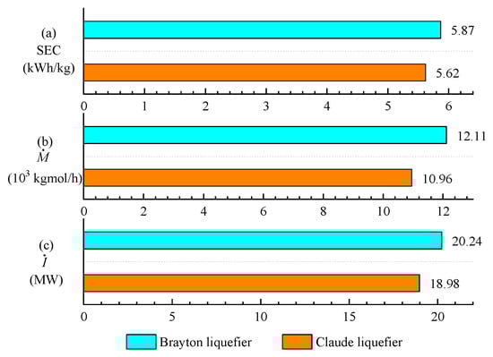 Performance parameters of two liquefiers: (a) SEC, (b) molar flow rate of refrigerant, and (c) exergy loss.