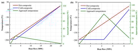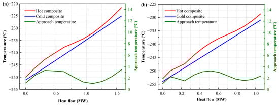 Composite curves of HX-3 in each liquefier: (a) Claude liquefier, and (b) Brayton liquefier.
