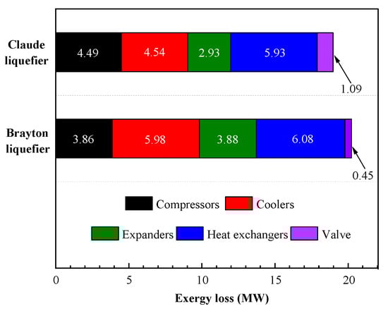The molar flow rates of hydrogen as refrigerant in the Claude liquefier and helium in the Brayton liquefier are compared, as shown in Figure 5b. The molar flow rate of refrigerant in the Claude liquefier is 10.6% less than that of refrigerant in the Brayton liquefier, which implies that the volume flow rate of associated equipment in the Brayton liquefier is greater than that of equipment in the Claude liquefier. In particular, the pressurization pressure of hydrogen in the Claude liquefier is considerably higher than that of helium in the Brayton liquefier, which results in more than twice the volume flow rate of the high-pressure refrigerant in heat exchangers in the Brayton liquefier than that of the refrigerant in the Claude liquefier. Therefore, the scale of equipment including heat exchangers, expanders and compressors in the Claude liquefier is smaller than those in the Brayton liquefier, thus reducing investment costs. In addition, the exergy loss of both liquefiers is given in Figure 5c. The exergy loss of the Claude liquefier is 18.98 MW, which is 6.6% less than the 20.24 MW of the Brayton liquefier. A detailed analysis of the exergy loss will be given in Section 3.4.