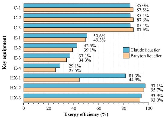 Due to the gasification of liquid nitrogen, the exergy efficiencies of HX-1 in both liquefiers are inefficient, especially in the Brayton liquefier. The exergy efficiencies of other heat exchangers in both liquefiers are excellent, with either heat exchanger exceeding 93%. In contrast to the poor compressibility, both hydrogen and helium have a better heat transfer capability [32]. The J-T valve is the key equipment in the hydrogen liquefier. As showed in Figure 8, the exergy loss of J-T valve in the Claude liquefier is more than twice that of J-T valve in the Brayton liquefier. On the one hand, because the Claude cycle is a non-complete liquefaction cycle, the mass flow rate of LH through J-T valve in the Claude liquefier is considerably more than that in the Brayton liquefier. On the other hand, in the Claude liquefier, liquid hydrogen appears in two-phase flow during the throttling process, which further increases the exergy loss in the J-T valve. Overall, owing to the higher exergy efficiency of compression and expansion systems, exergy loss of the Claude liquefier is 6.6% lower than that of the Brayton liquefier.