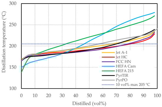 The following samples were studied: Jet A-1—the hydrotreated straight-run kerosene distilled from light crude oil. It was a commercial refinery product for which a quality certificate was available. A similar sample can be obtained in a number of oil refineries. Therefore, it was used to validate the measured data. This sample represented a substantial part of the jet fuel currently produced []. Jet HC—kerosene produced by deep hydrocracking of vacuum distillates from medium-heavy crude oil, of the quality used in the refinery for Jet A-1 production. A similar sample can only be obtained in some oil refineries since it requires adding stabilization, kerosene fraction additivation and separate storage and distribution of jet fuel to the standard hydrocracker unit. This utilization of kerosene provides an interesting opportunity for hydrocracking-type refineries to increase refinery margins []. FCC HN—hydrotreated heavy naphtha obtained by fluid catalytic cracking (FCC) of atmospheric residue from light crude oil, subsequent redistillation of FCC gasoline on a 3-cut splitter and hydrotreating of heavy fraction. FCC hydrotreated heavy naphtha is the standard output of the catalytic cracking process. The fraction is commonly used for the blending of mogas and is currently also used for the production of jet fuel as a drop-in component in units of percent. This represents an opportunity to diversify the products from the FCC. PyrTIR—kerosene from scrapped tires pyrolysis oil from an external pilot unit, hydrotreated in a laboratory scale fixed-bed catalytic unit [,] with a capacity of 33 g·h−1 under severe conditions (360 °C, 10 MPa, commercial hydrotreating NiMo/γ-Al2O3 catalyst) and redistilled in the laboratory as a fraction with the distillation range of 150–240 °C. PyrPO—kerosene from waste polyolefins pyrolysis oil, treated as described above for the previous sample. Both samples based on pyrolysis oil were prepared specifically for this research. Considering the capacity of the laboratory unit and the yield of kerosene from the hydrotreated product, it was difficult to obtain a sample in the required quantities. Therefore, the focus, in this case, was on the critical and specific properties of jet fuel. Jet fuel from the pyrolysis of waste polyolefins and scrapped tires represents an important opportunity to implement the chemical waste recycling concept and is a major research and development challenge currently. All of the above samples can be considered to be crude oil based. HEFA Cam—biokerosene made from camelina, for which quality data were available from an independent laboratory because this component was previously used to research drop-in components for jet fuel []. HEFA 215—biokerosene provided by a partner laboratory from an undisclosed source as an alternative to HEFA from camelina. Both HEFA samples met the quality requirements of ASTM D7566 [], which was considered essential for their use in research. HEFA, as an alternative jet fuel, is currently the focus of attention of SAF producers, aircraft manufacturers and major airlines.