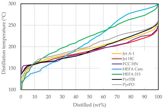 Since not enough PyrPO sample was available to determine the ASTM D86 distillation, it was substituted in Figure 1 by values calculated from SimDist. The distillation curves of the crude oil-based samples, including PyrTIR and PyrPO, were very similar, the distillation range was relatively narrow (95–5 vol% < 59 °C) and the samples were characterized by a large reserve at 10 vol% distillation temperature and the end of distillation compared to the requirements of JET A-1. The distillation curves of the two HEFA samples differed from the crude oil-based samples and were characterized by a significantly higher range of boiling points (95–5 vol% > 96 °C), therefore, they were steeper.